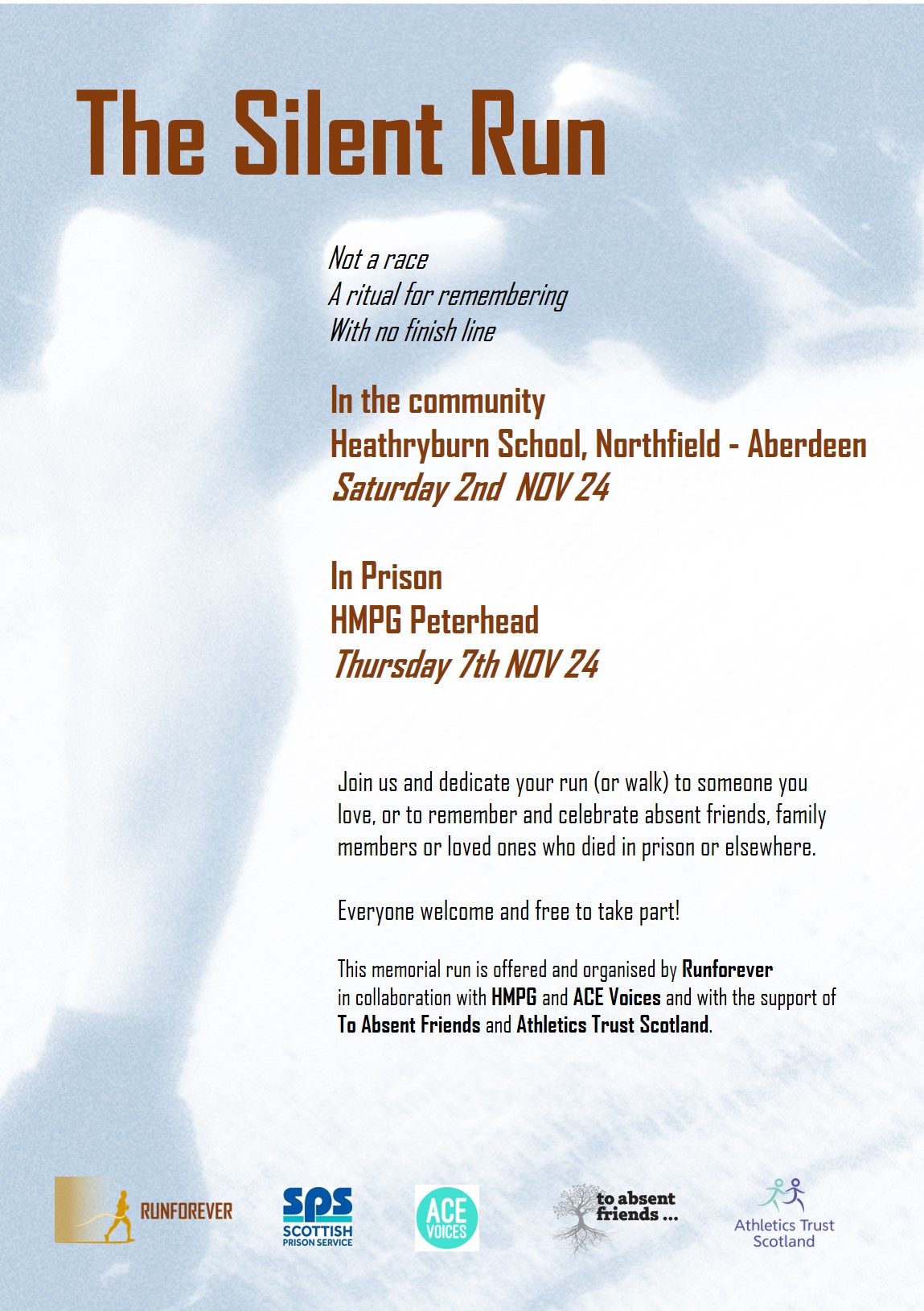 The Silent run – To Absent friends memorial run (or walk) at HMPG and in the community for celebrating people who died in prison or prisoners’ loved ones. Organized by Runforever in collaboration with HMPG, ACE Voices and with the support of To Absent Friends and Athletics Trust Scotland.